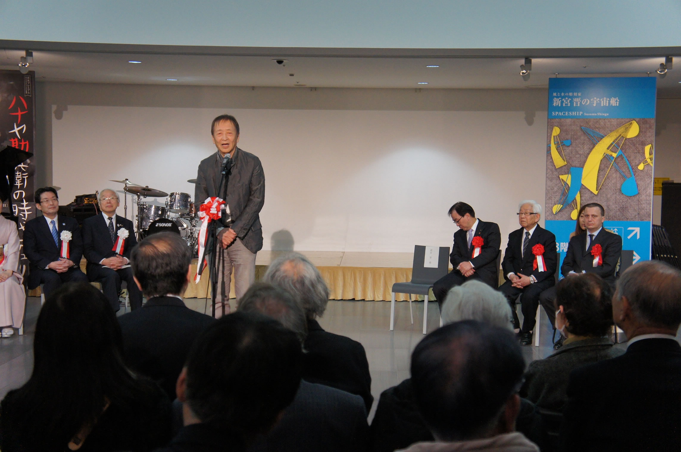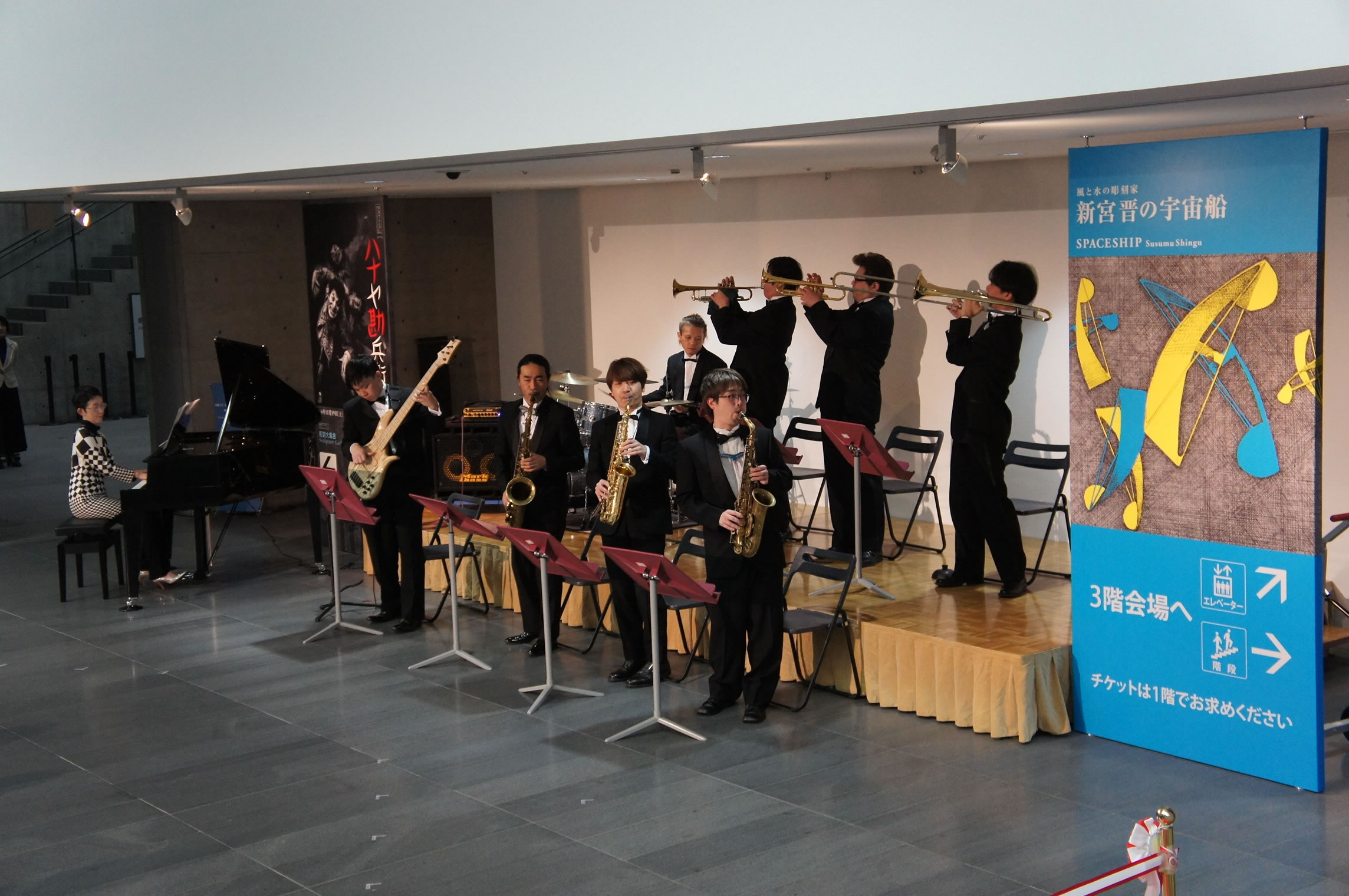 3月18日(土)開幕の特別展「新宮 晋の宇宙船」。井戸兵庫県知事や在大阪イタリア総領事、三田市長ほか220人が、オープニング式典につめかけました。風ミュ・ジャズオーケストラのピックアップメンバーでオープニング演奏させて頂き、その後でじっくり作品を鑑賞させて頂きました。どれも素晴らしい作品ばかり。ほんと面白いですよ!お薦めします!5月7日までやっていますので、是非行ってみて下さい。