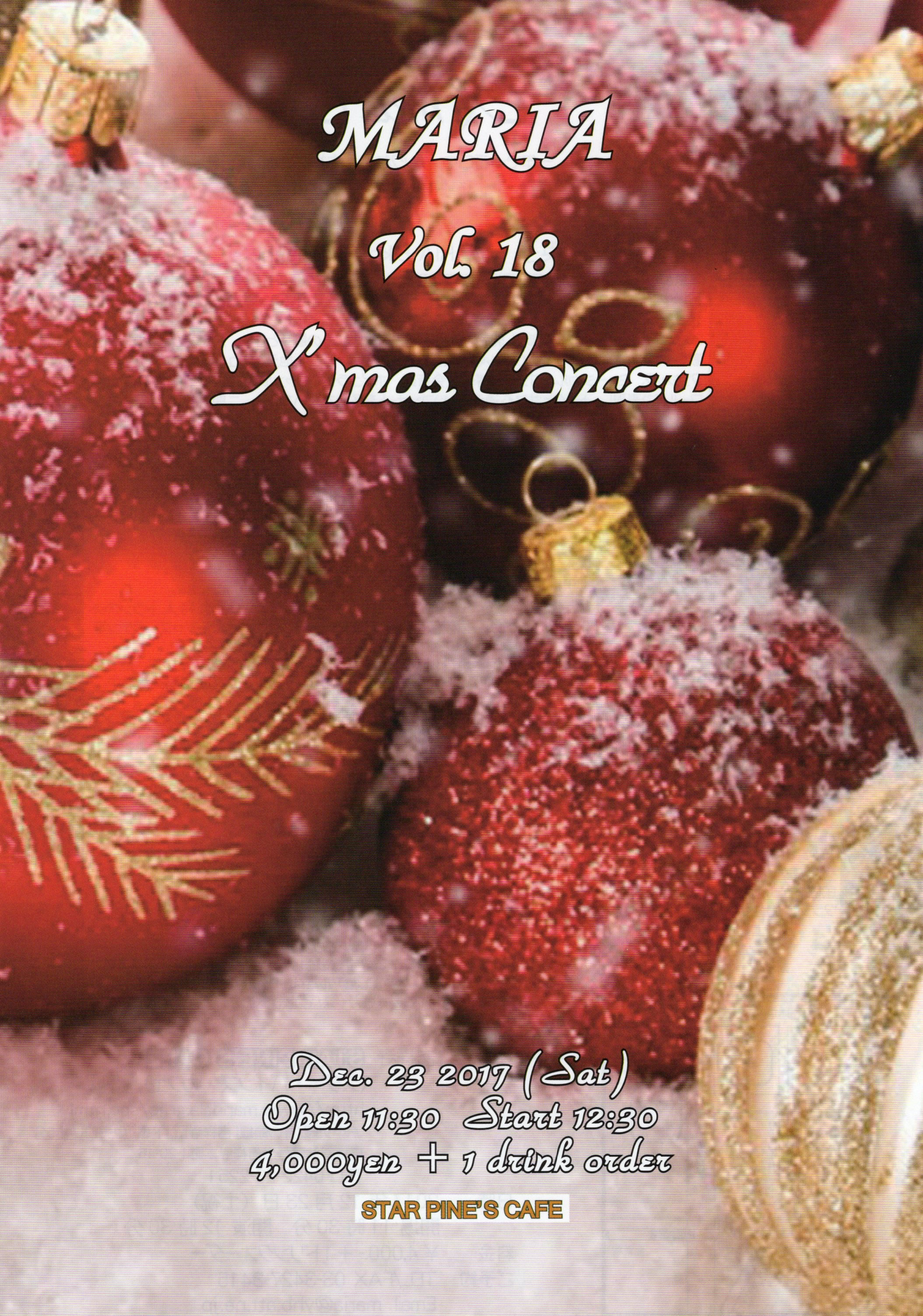マリアさんのクリスマスコンサート、立ち見も出るほどの超満員のお客様!都内からだけでなく関西からのお客様も…マリアさんの人気ぶりが伺えます。 クリスマスソング、ジャズ、映画音楽、タンゴ等々盛りだくさんのプログラムでしたが特にアンコール曲はウルウルしながらの演奏、感動ものでした。こんな素敵なコンサートに参加させて頂いて本当に有り難うございました。
